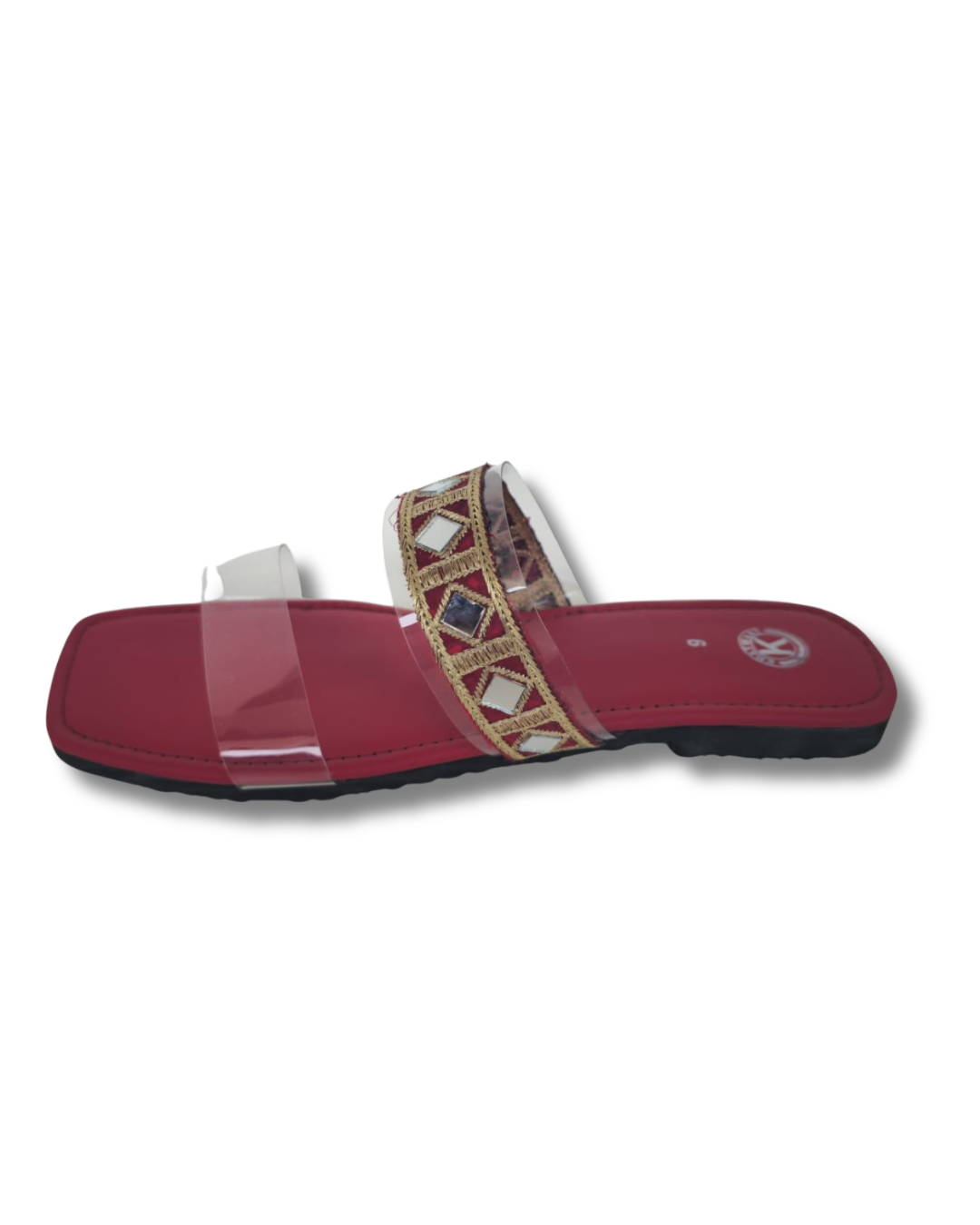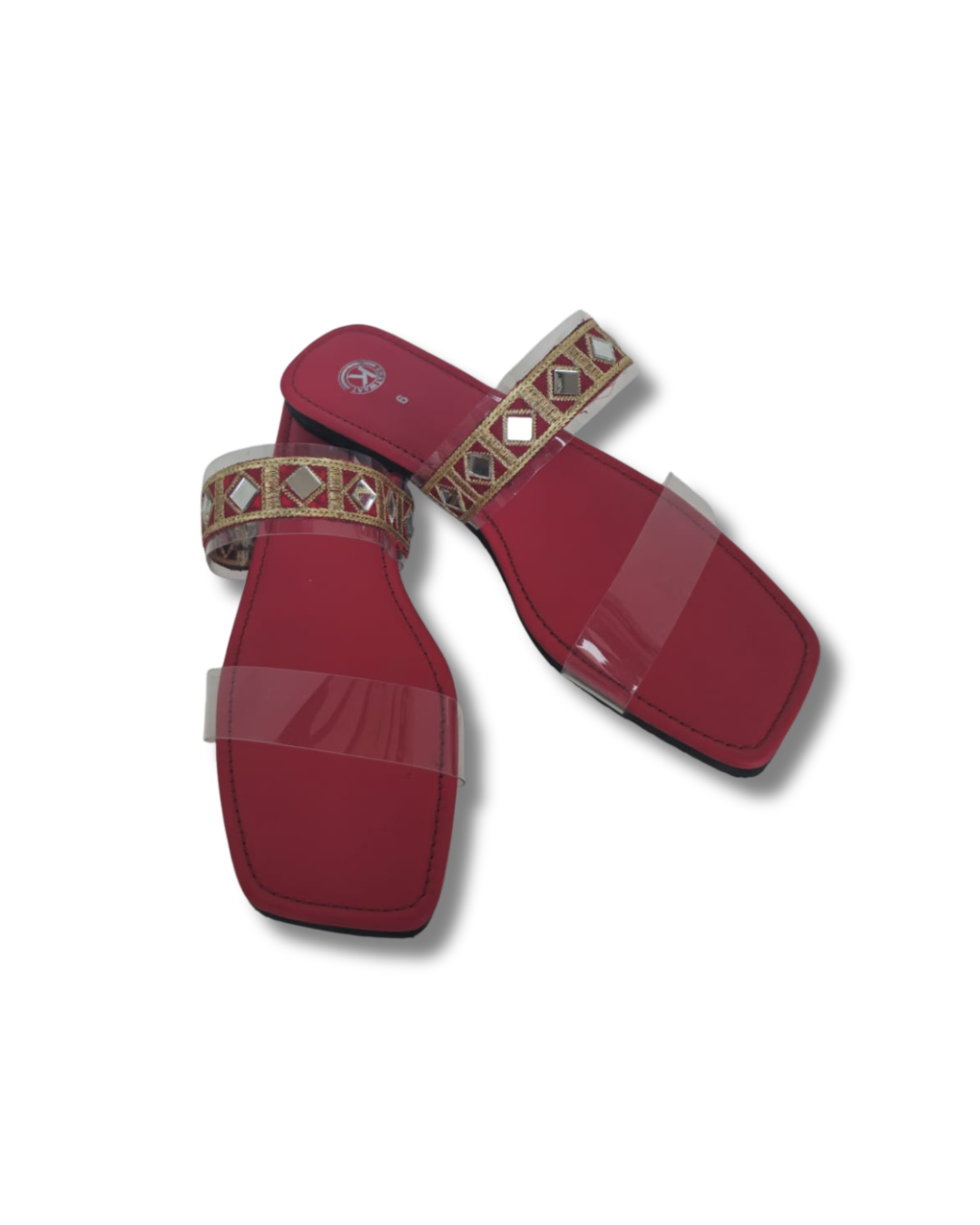 | Upper Design | Dual-strap layout (One transparent, one embellished) |