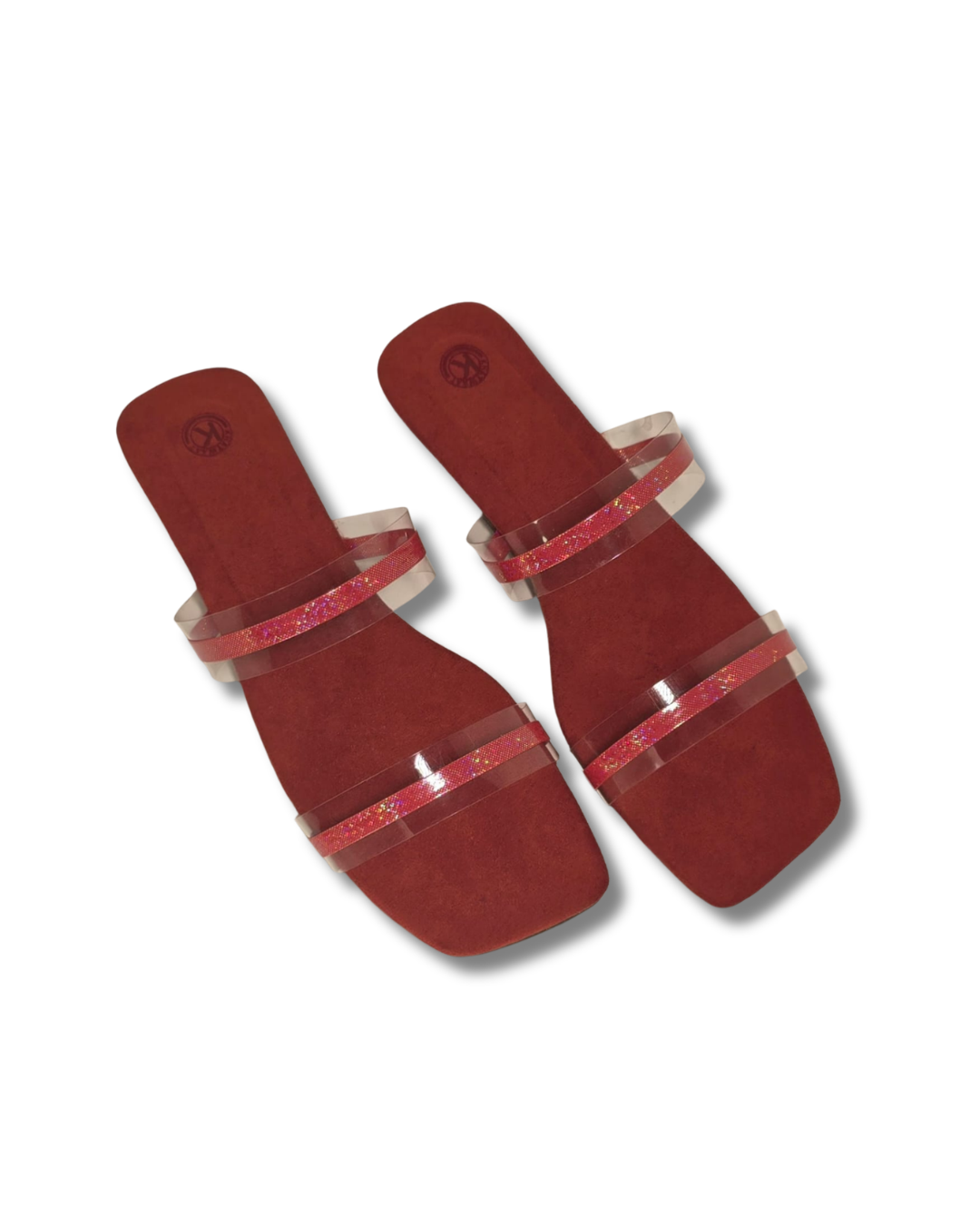 Own a piece of footwear history with the first-ever Arabic sole material sandals launched in Pakistan. These slides feature a modern square-toe design in a rich ruby red, accented by dual transparent straps with a sparkling glitter inlay.